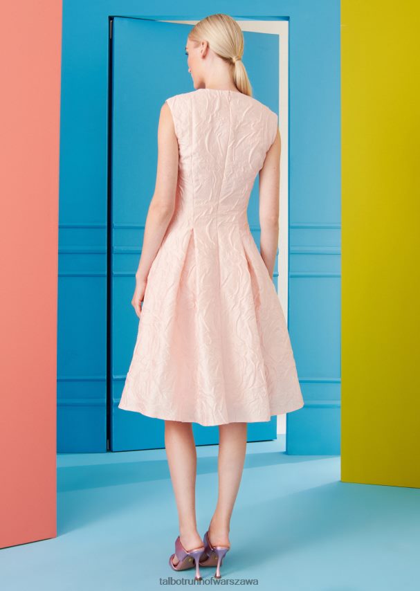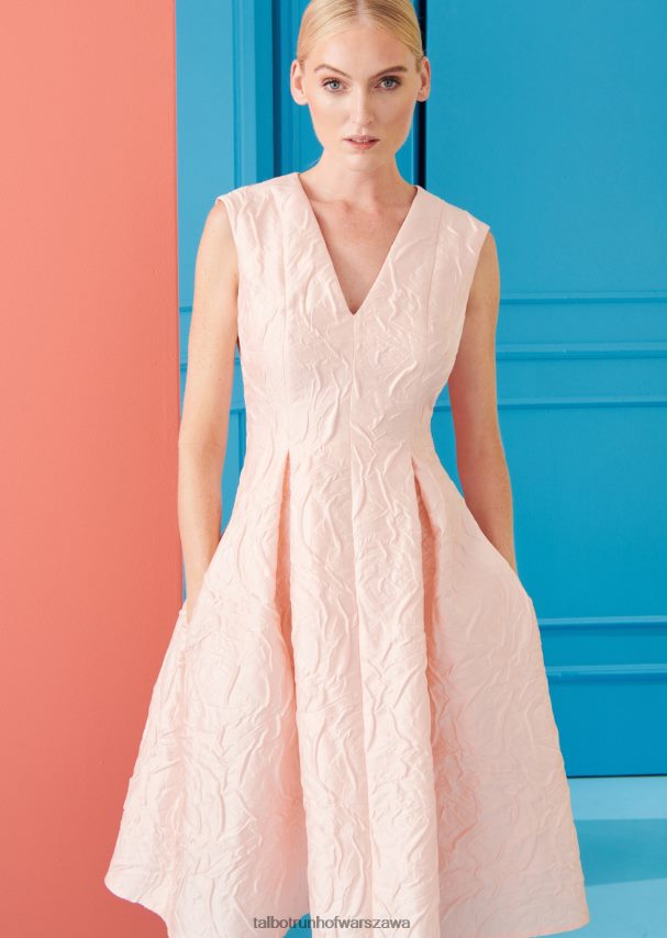 Dzięki temu projektowi nasi projektanci stworzyli sukienkę koktajlową wykonaną z błyszczącego, jasnego żakardu w kwiaty, zapewniającego subtelny seksapil. Głęboki dekolt w kształcie litery V podkreśla dekolt. szeroka spódnica ma wirującą zasłonę, która nadaje dziewczęcy wygląd. załóż tę dopasowaną i rozkloszowaną sukienkę na kolejne ważne urodziny w gronie przyjaciół lub na tętniącą życiem imprezę firmową w najlepszej restauracji w mieście. głębokie, odwrócone plisy otwierają się przy każdym skręcie na parkiecie, dodając jeszcze więcej szaleństwa. więc: zdejmij buty i tańcz!