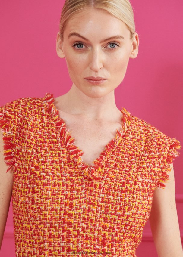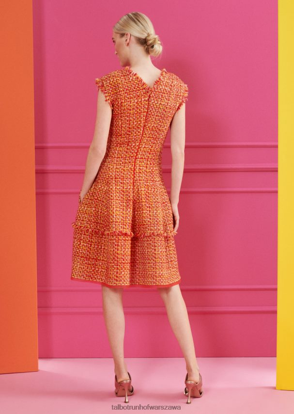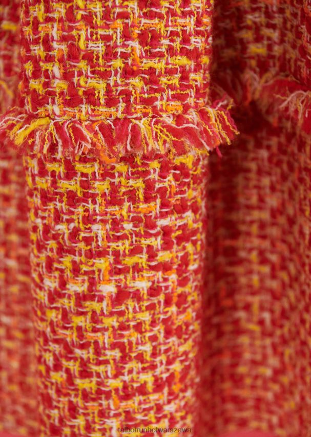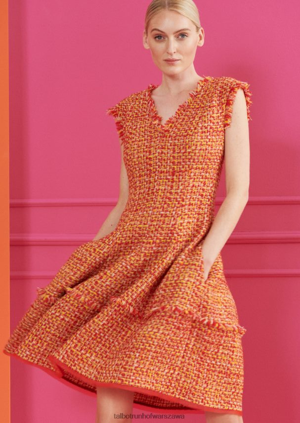 Ta dzienna sukienka z kolorowego tweedu łączy w sobie klasykę z nowoczesną, swobodną elegancją. Dopasowany i rozszerzany krój z wyraźnie zaznaczoną talią i falbanką spódnicy sprawiają, że ta sukienka będzie wyglądać idealnie i będzie Ci towarzyszyć przez cały dzień. dyskretny dekolt w kształcie litery V podkreśla dekolt, a detale z frędzlami nadają tej krótkiej sukience zabawny, zalotny akcent. koniecznie wypróbuj ją z jedną z naszych skórzanych kurtek. w połączeniu z sandałami z paskami i wspaniałą biżuterią ta stylizacja sprawdzi się równie dobrze w teatrze, jak i na festynie w Paryżu lub Londynie.