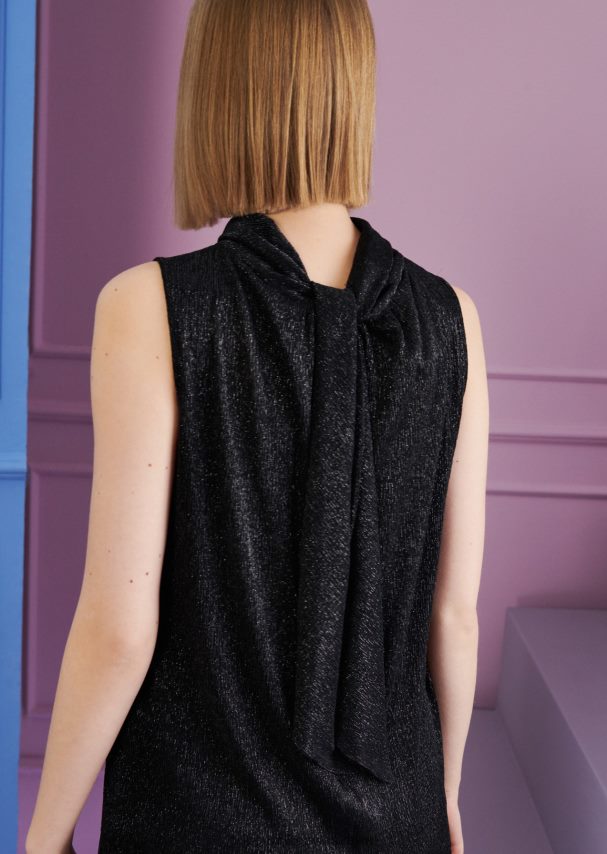 powrót do podstaw! cóż, nie do końca podstawy, bo choć ten top pasuje prawie do wszystkiego, ma też mnóstwo własnego uroku. jest wykonany z naszego super lekkiego metalicznego woalu dla dodatkowego komfortu. stójka wiązana z tyłu. sylwetka tego topu bez rękawów jest lekka i przewiewna. ten top jest tak uniwersalny, że możesz go stylizować niemal ze wszystkim: ze wzorzystą spódnicą midi, dżinsami i szpilkami, z dopasowaną spódnicą ołówkową lub pod satynową marynarką, aby uzyskać mocny, wyrazisty wygląd.